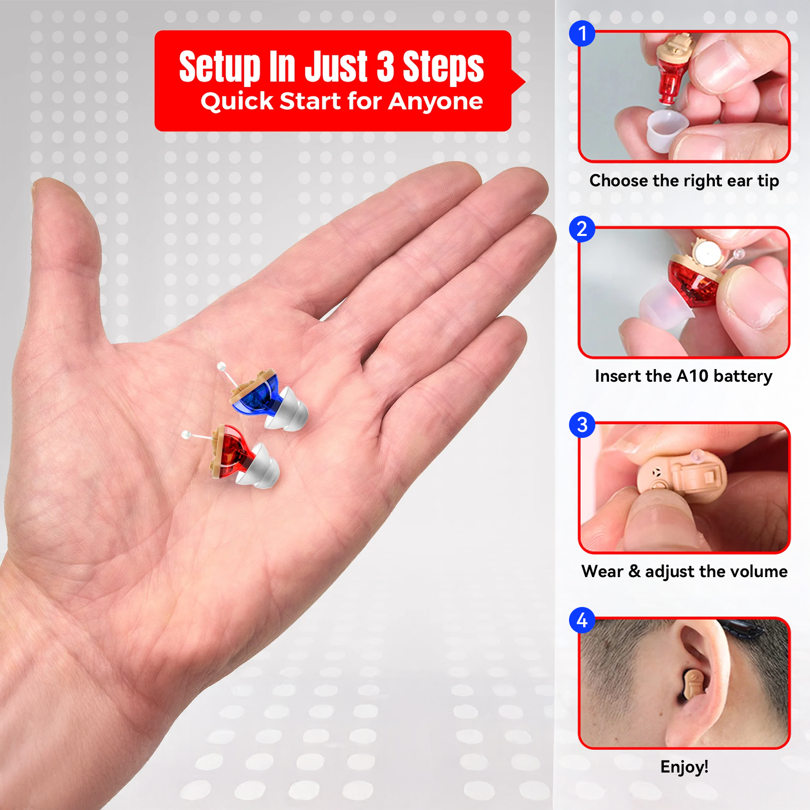 Quick and simple to install, with just a few steps you’re ready to go. No tools or assistance needed, so you can start enjoying clear hearing with ease.