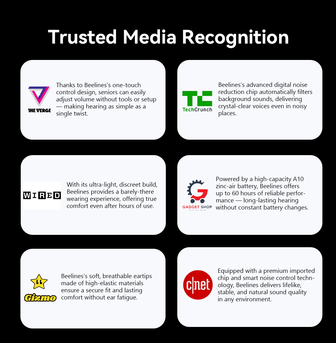 Beelines uses high-performance chips, smart noise reduction, and a comfortable design to deliver clear sound, easy operation, and all-day comfort, helping users enjoy natural hearing again.