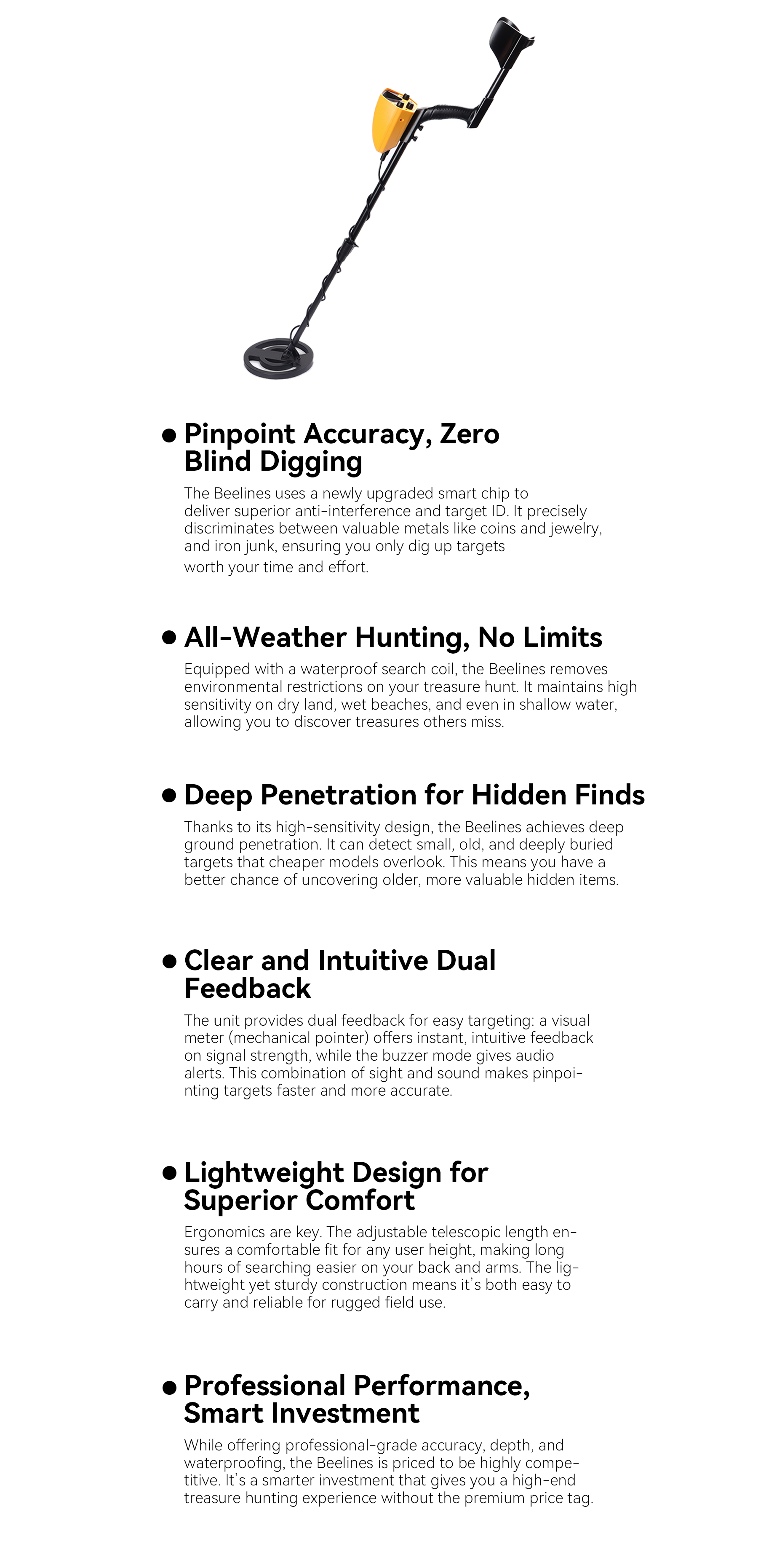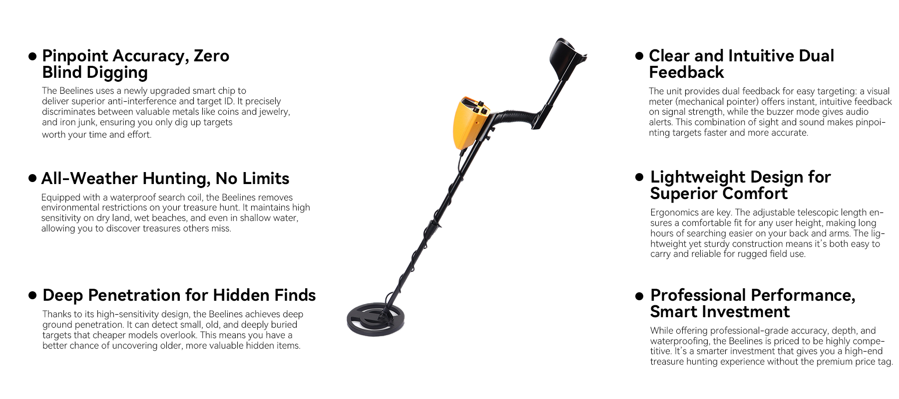 That belief led to Beelines. The brand promises to use reliable tech, like smart chips and fully waterproof design, to make metal detecting precise, deep, and unrestricted. Its mission is to bring the genuine joy of discovery to all enthusiasts.